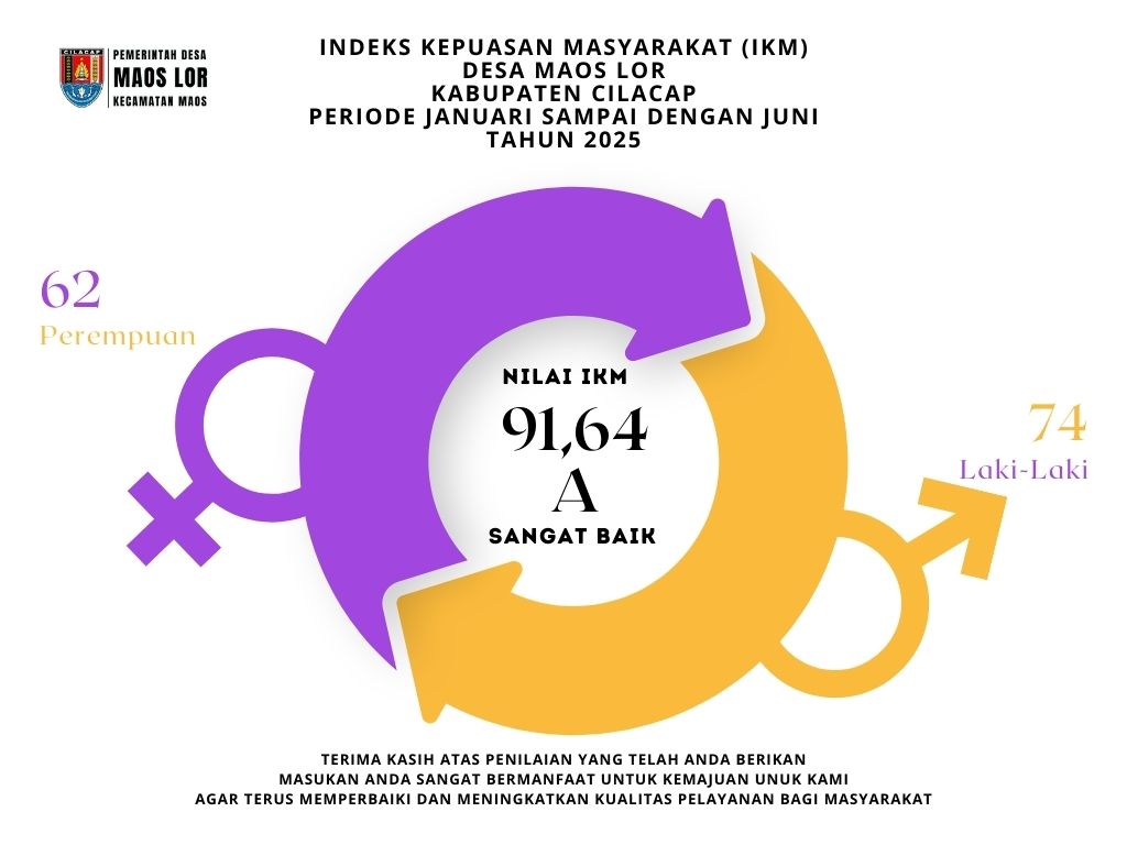 Sebagai bagian dari komitmen untuk terus meningkatkan kualitas pelayanan publik, Pemerintah Desa Maos Lor telah melaksanakan Survei Kepuasan Masyarakat (SKM) semester I tahun 2025. Survei ini bertujuan untuk mengukur kepuasan warga terhadap berbagai aspek pelayanan desa, serta memberikan landasan bagi evaluasi dan perbaikan yang berkelanjutan. Dari hasil survei, diperoleh Indeks Kepuasan Masyarakat (IKM) sebesar 91,64 , yang masuk dalam kategori SANGAT BAIK. Angka ini mencerminkan bahwa secara keseluruhan, masyarakat Desa Maos Lor merasa puas dengan pelayanan yang diberikan oleh pemerintah desa.